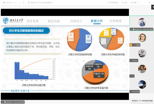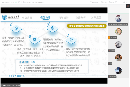 分享过程中,张龙同学详细介绍了所在团队构建的结构方程模型与调查采取的抽样方法,以及采用SPSS和AMOS软件进行描述性统计、信效度检验和路径分析的结果。最后张龙同学认为未来研究可进一步探索数字教育背景下在线课堂的沉默特征以及进行跨文化比较研究。
