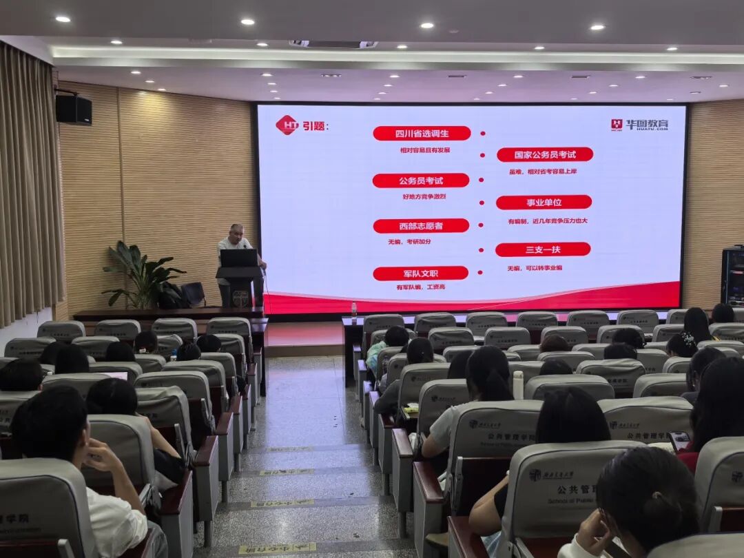 研究生会与华图教育机构联合举办,由华图教育的孙伟老师主讲,围绕国省考和选调生考试考情、备考与选岗技巧、各市州公务员待遇和未来发展以及本校同学历年报录情况等内容展开,为与会同学带来了详细的考情讲解和备考指导。
