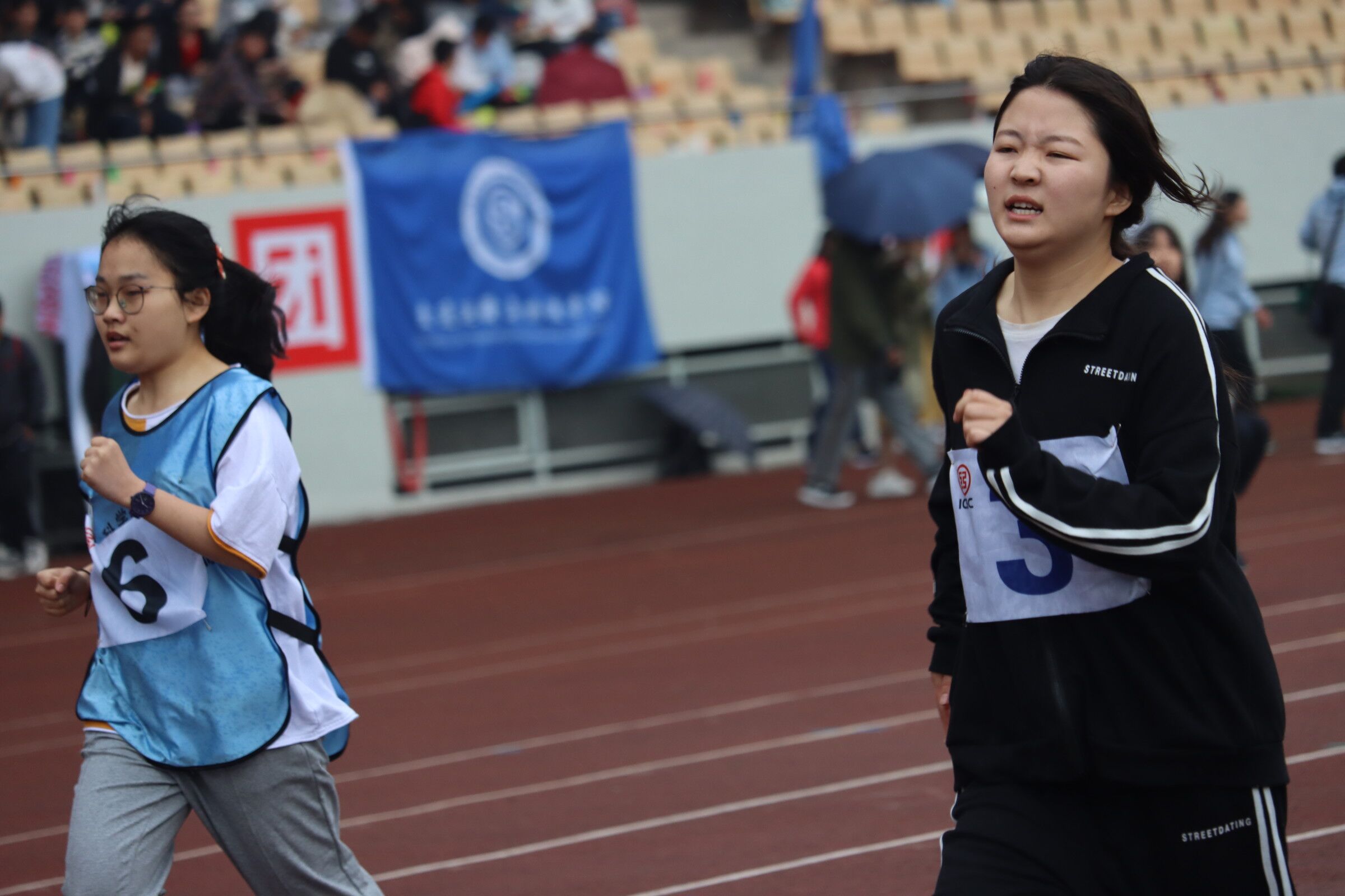 上午9:20,女子400米决赛在北区体育场如期举行。比赛开始前,曹颖同学站在跑道上整装待发。“砰!”一声枪响,选手们仿佛挣脱了束缚一般,向前冲刺着。只见曹颖同学眉头紧锁,牙齿紧紧地咬着,手快速地摆动,脚迈出的步伐越来越大。雨水滴落在她的衣衫,浸湿她的头发,但她丝毫不懈怠,全力追逐,以第八名的优异成绩为今天的比赛挂上完美的句号。