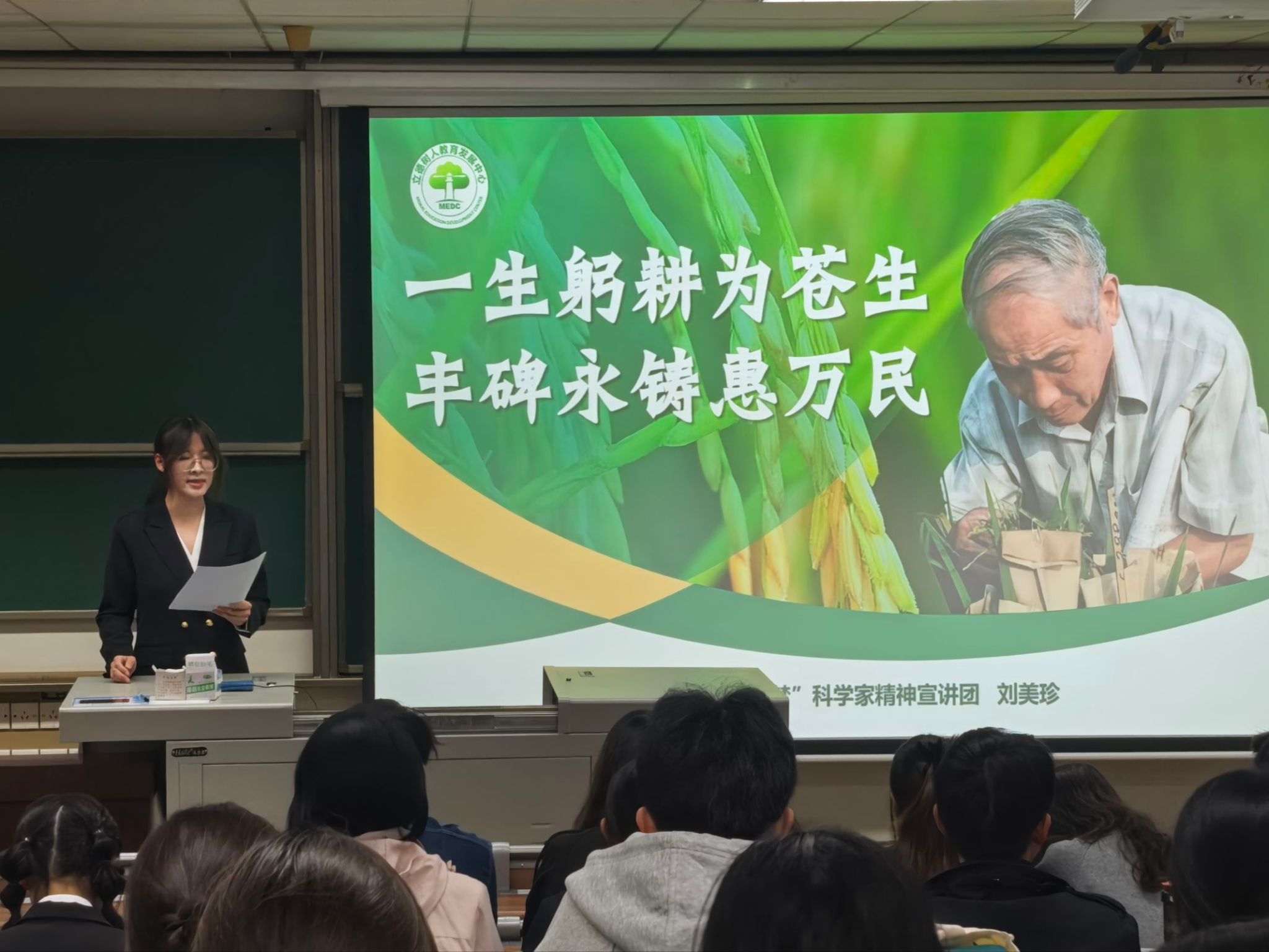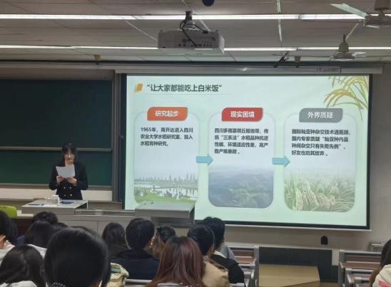 刘美珍从“让大家都能吃上白米饭”“还有一本书需要你们去读”“一名共产主义战士”三个方面对周开达院士进行了详细的介绍。周开达院士扎根水稻育种领域,攻克四川丘陵地区"三系法"水稻抗逆性差、产量不稳等难题。面对技术封锁与学界质疑,他坚持"读稻田之书",将论文写在祖国大地上。在宣讲学习期间,学生会同学们仿佛穿越时空,与周开达院士一同在科研的田野上耕耘,深刻领略其精神魅力。