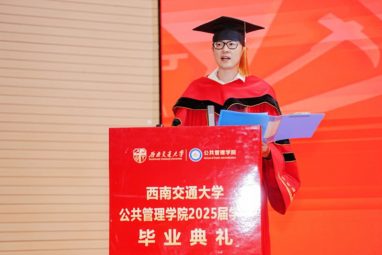 院长李华强教授登台,目光满含欣慰与期许,热烈祝贺各位同学顺利完成学业!李院长语重心长地嘱托,希望同学们将在学院所学的公共管理知识与智慧,化作服务社会的力量,在各自岗位上践行 “公行天下,管济四海”的使命。最后,李院长希望同学们毕业后可以常回母校看看。