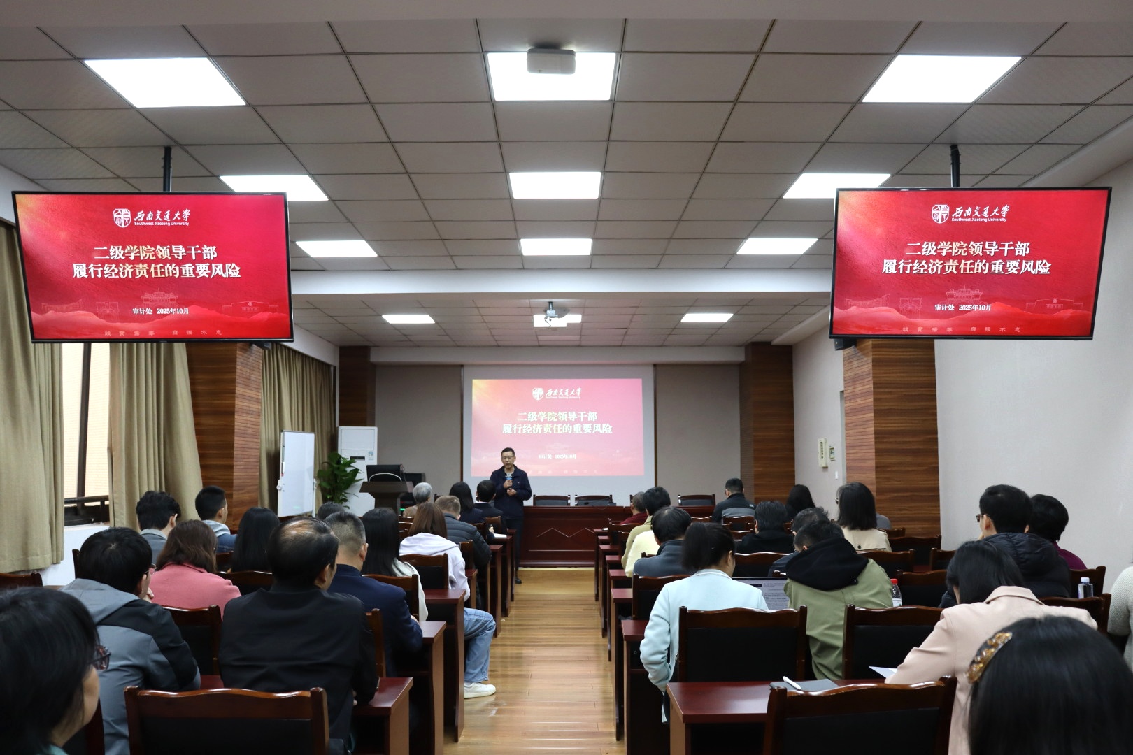 会议伊始,审计处处长俞建海和副处长黄海霞以 “权、责、廉” 为核心要义,系统解读经济责任审计的核心要求与实践路径。黄海霞强调,学院干部作为公共资源管理的关键主体,审计工作需全面覆盖政策落地成效、决策科学性等关键领域,严格遵循 “党政同审”“任中审计为主” 的工作原则,推动监督管理常态化、长效化。她通过PPT 直观呈现 “六大经济责任” 体系,从法律法规执行到问题整改闭环,全方位涵盖经济工作关键环节。同时,结合典型案例深度剖析国家政策落实不到位、“三重一大” 决策不规范、资产安全管理疏漏等十大风险点,以 “案例警示+风险拆解” 的方式,为全体教职工敲响规范用权、廉洁履职的警钟。